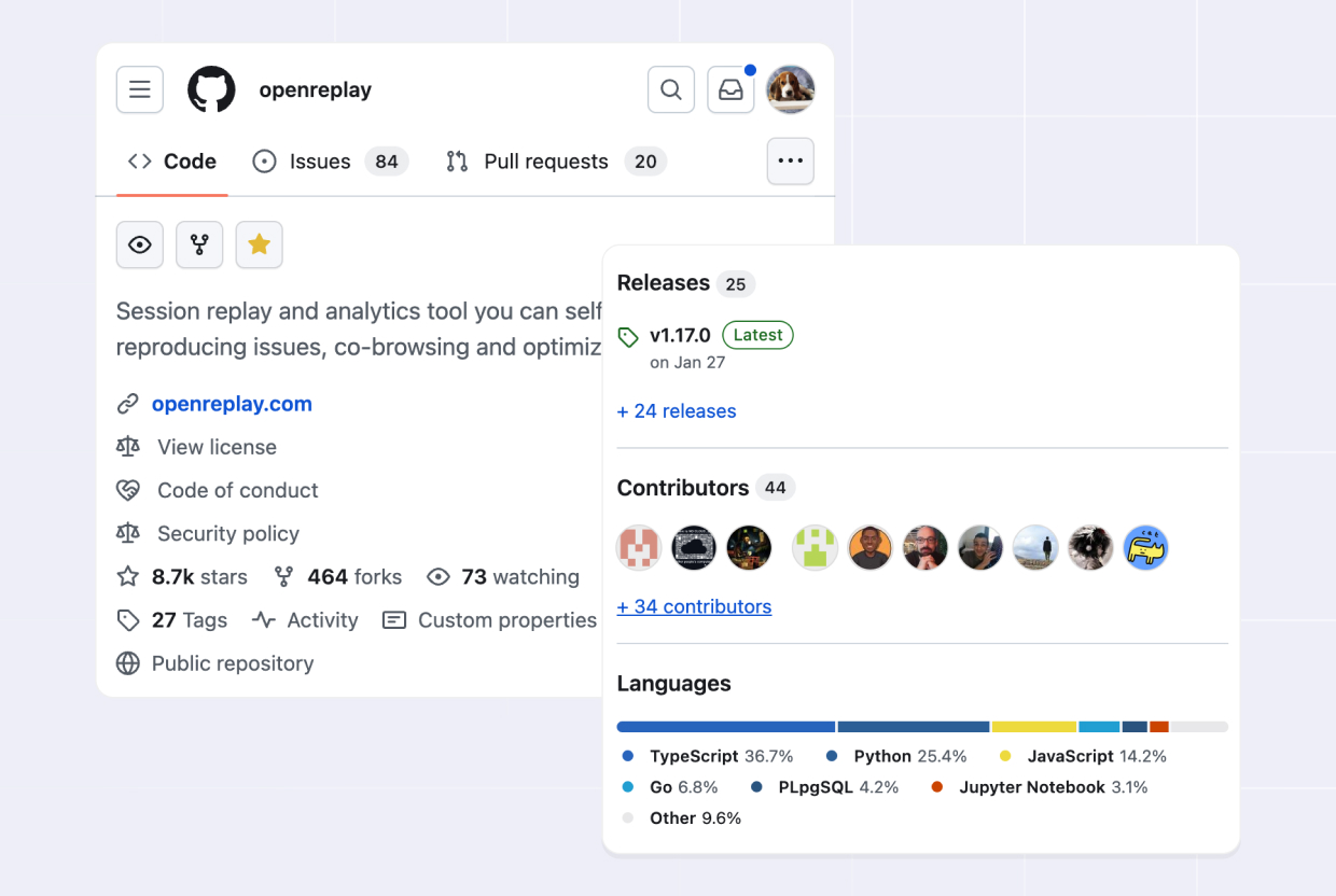 OpenReplay builds its product openly on GitHub, enabling developers to audit the code, enhance functionality, and contribute.